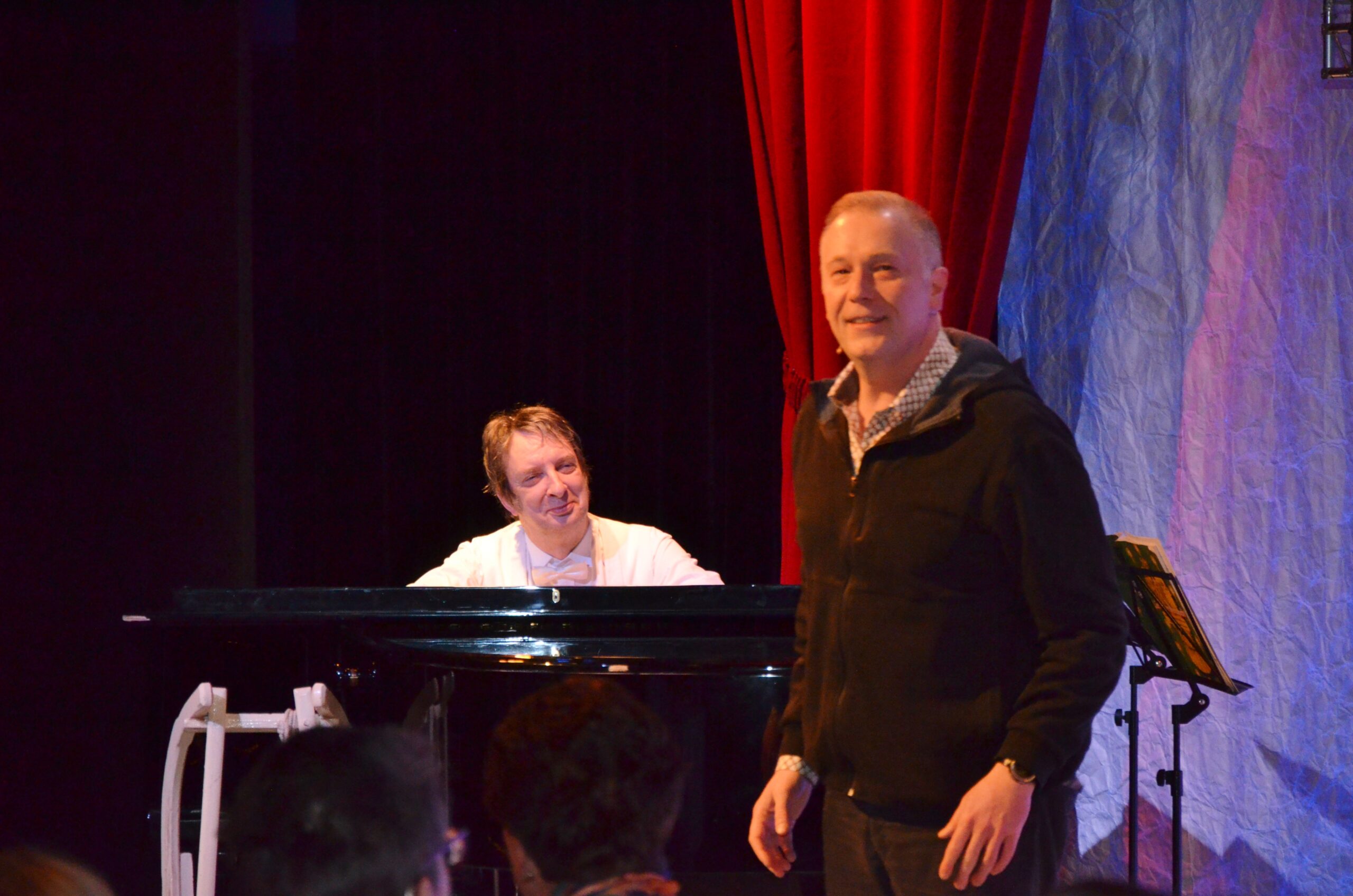 Olaf Kröger und Manuel Kressin präsentierten heitere und zugleich kunstvolle Ausschnitte aus ihrem aktuellen Weihnachtsprogramm „Die Kunst, aus der Freude gar nicht rauszukomm´n“. Im wunderbar klingenden Berliner Dialekt erklang das „Lied von der Krummen Lanke“, (Musik von Fredy Sieg). Weitere musikalische Höhepunkte waren unter anderem Werke von Hanns Eisler/Kurt Tucholsky) mit „Wenn die Igel in der Abendstunde“ sowie ein humorvoller Abschluss, bei dem Olaf Kröger einmal mehr sein großartiges virtuoses, kompositorisches und improvisatorisches Können unter Beweis stellte. Das Lied „Wir haben Hunger, Hunger, Hunger“ erklang mit ihm am Flügel in unterschiedlichen Kompositionsstilen – von J. S. Bach, W. A. Mozart über R. Wagner und L. v. Beethoven bis hin zu seinem eigenen Stil.