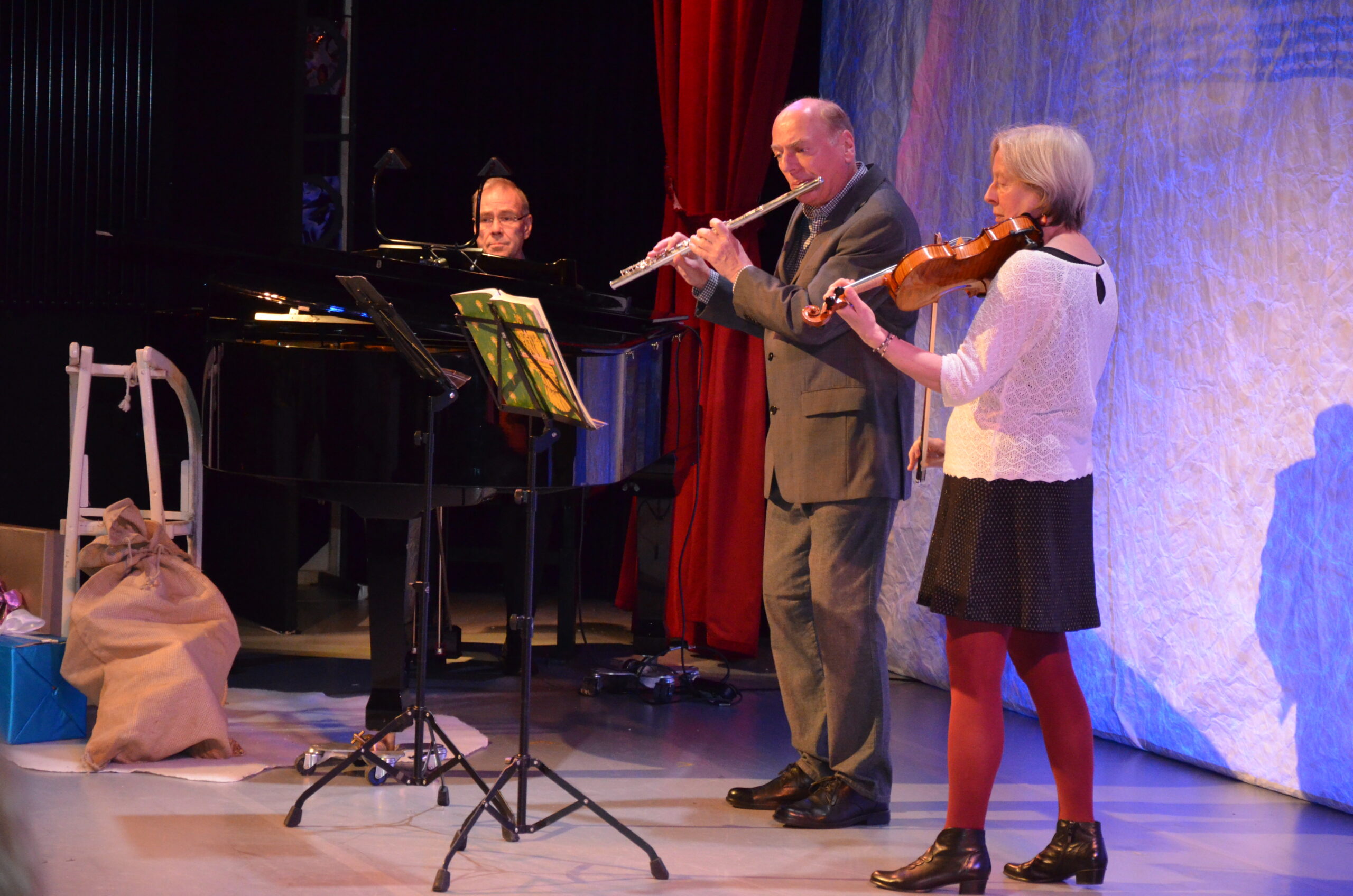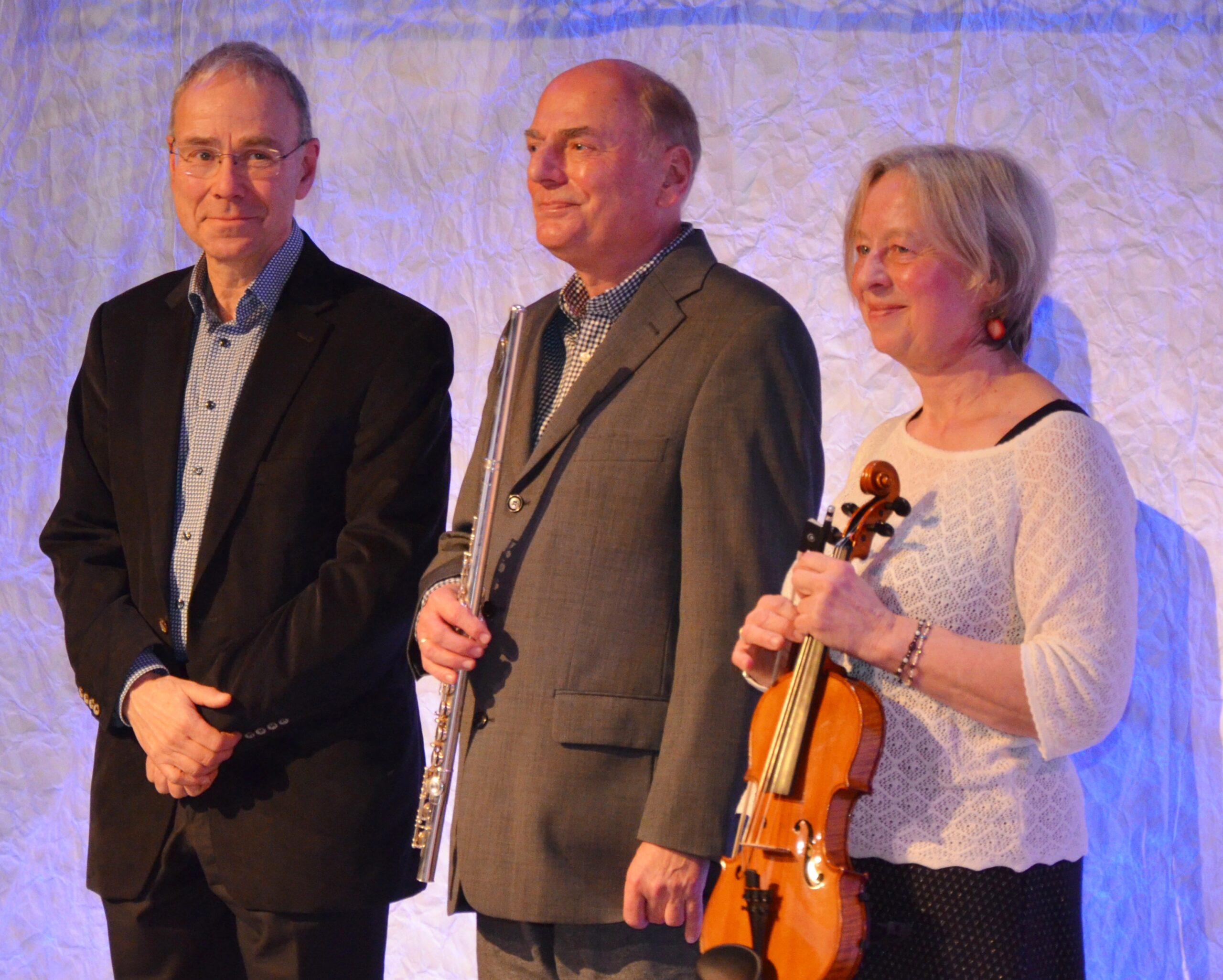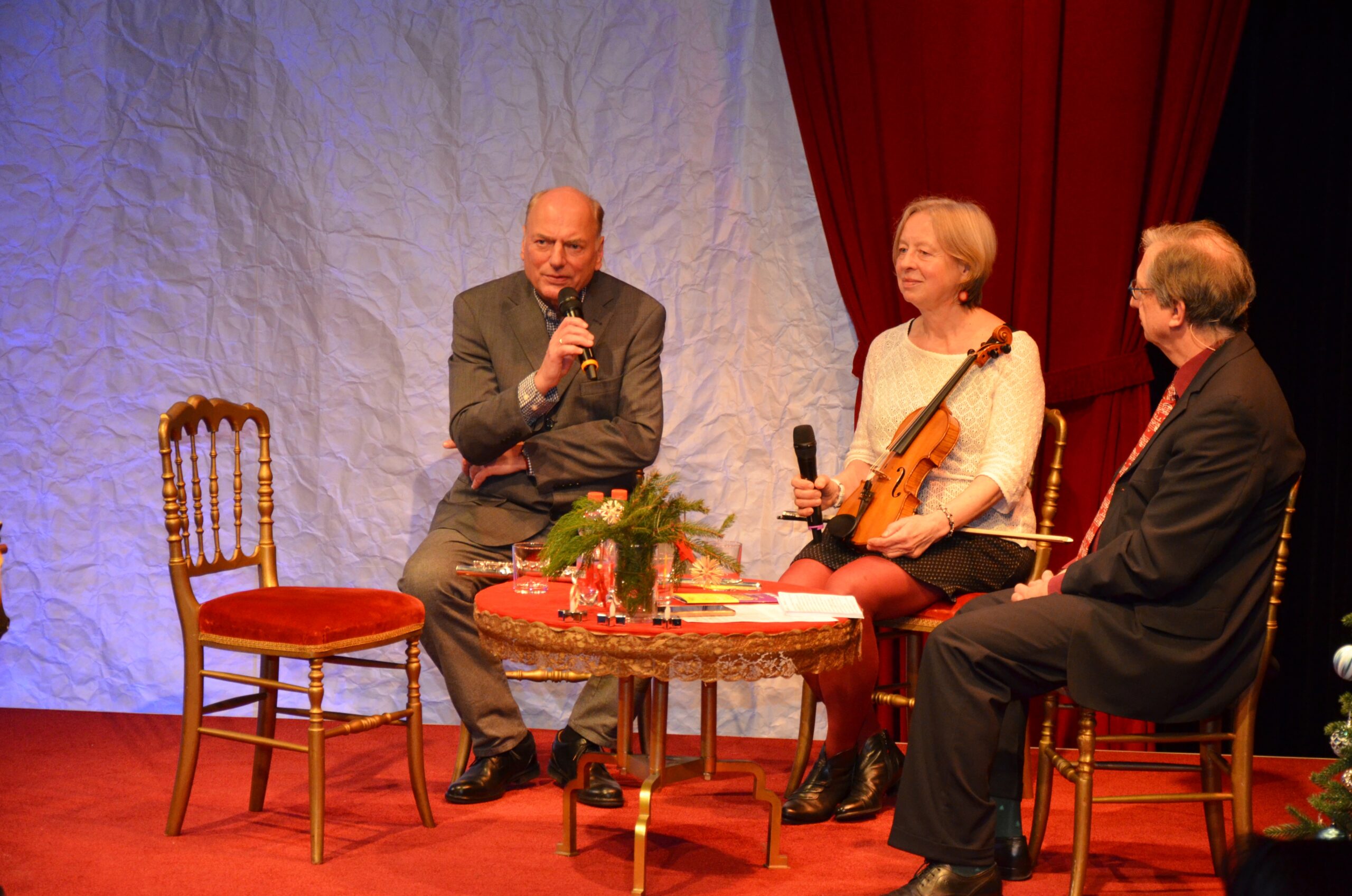 Annegret und Andreas Knoop brachten in Begleitung von Hinrich Steinhöfel am Flügel mit dem Weihnachtslied „Süßer die Glocken nie klingen“ eine besinnliche Stimmung zum Mitsingen in den Saal. Im Interview erzählte der aus Güstrow stammende Andreas Knoop (Flötist) von seiner enttäuschenden Ankunft am Geraer Hauptbahnhof 1982 und der freudigen Überraschung beim Anblick des Geraer Theaters und seinem besonderen Konzertsaal. Schließlich hielt ihn die Liebe zur Konzertmeisterin und Violinistin Annegret in Gera, wo beide 43 Jahre als geschätzte und beliebte Orchestermusiker sowie als Solisten tätig waren. Zum Abschied erklang Musik von Jacques Ibert, Interlude für Flöte, Violine und Klavier.